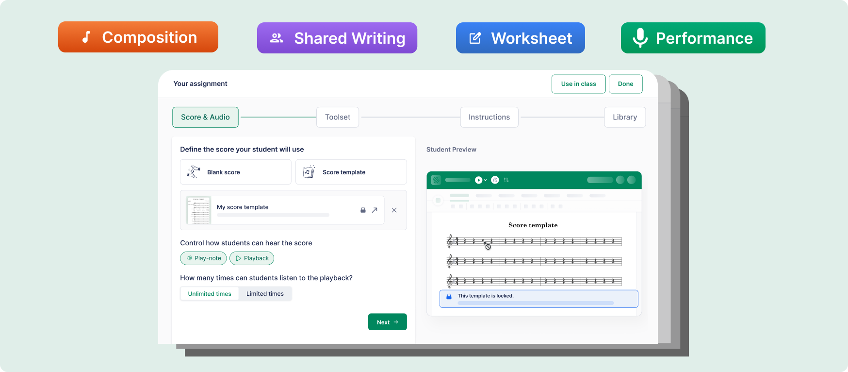 - Performance assignments: students record audio directly against a score using their device microphone, submitting notation and audio together for a single integrated assessment