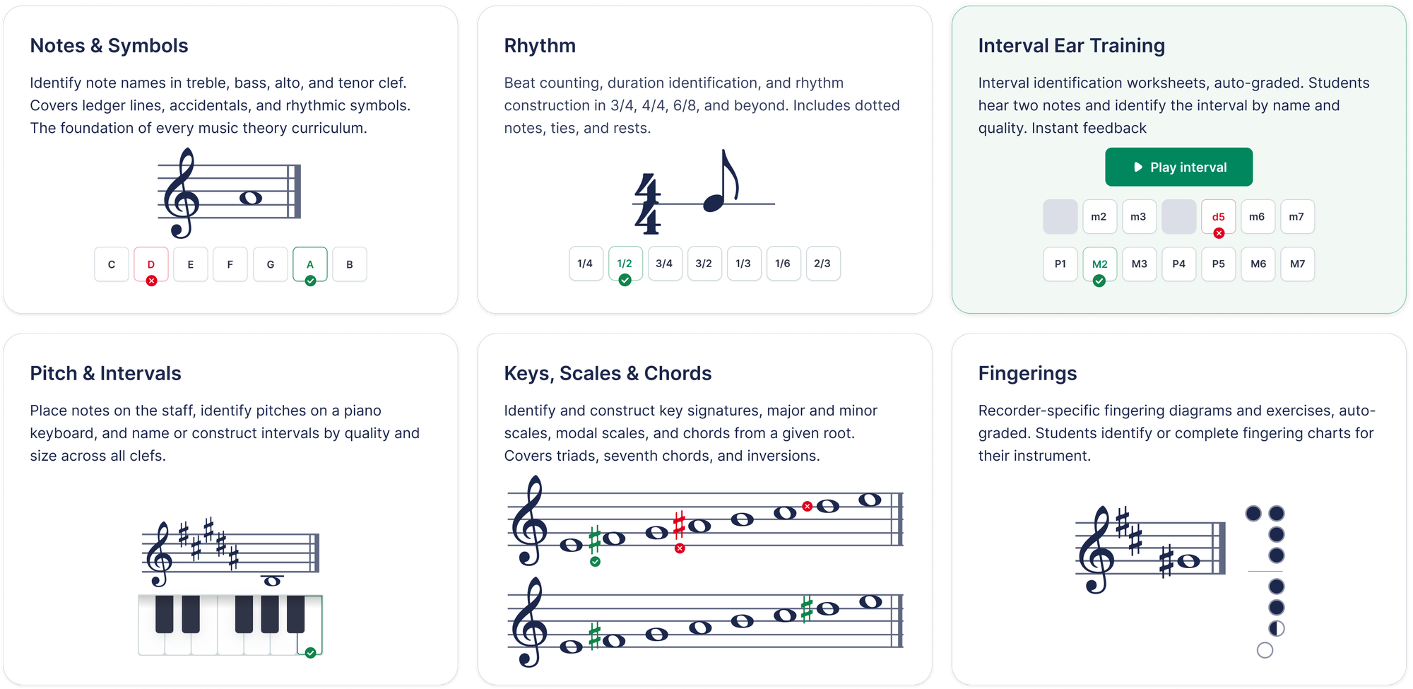 The other significant difference is what else is included. Flat for Education is a full music education platform. The sight-reading generator sits alongside the notation editor, auto-graded music theory worksheets, composition assignments, performance assignments, a tuner, a metronome, a tone generator, ear training worksheets, fingering worksheets, and LMS integration across Google Classroom, Microsoft Teams, Canvas, Schoology, and MusicFirst. If you're already using Flat for Education for composition and assessment, the sight-reading generator is already included in your plan. No additional cost, no additional login, no separate system.