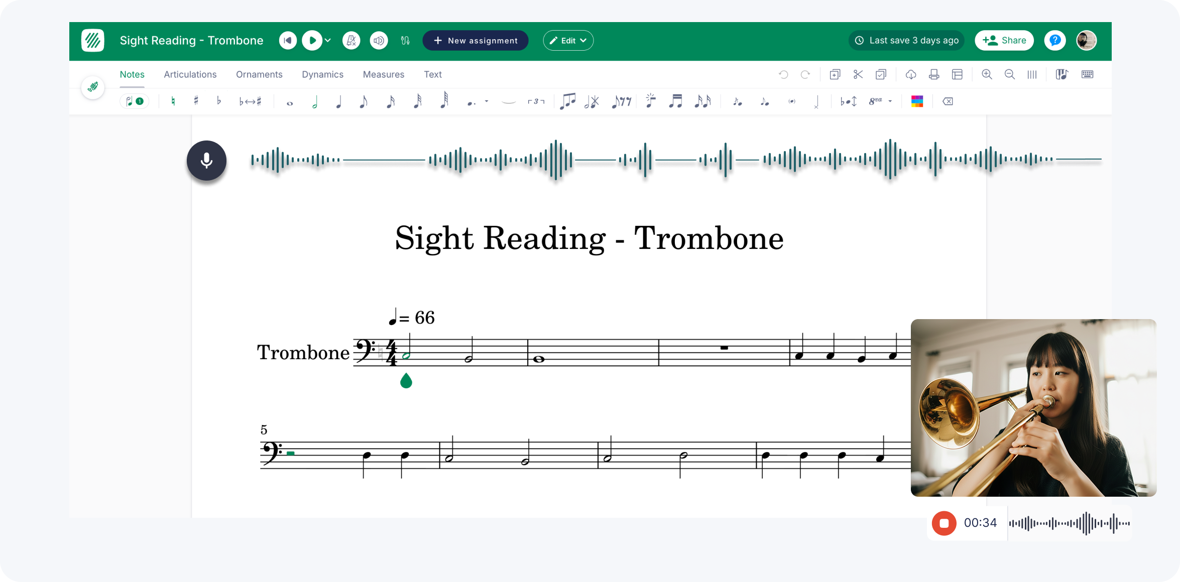 That's a different experience for both student and teacher. The teacher sees the score the student was reading while hearing the recording, which makes it much easier to identify exactly where the reading broke down and why. The student's sight-reading record is part of their overall profile in Flat for Education, alongside their compositions and other submissions, rather than sitting in a separate system.