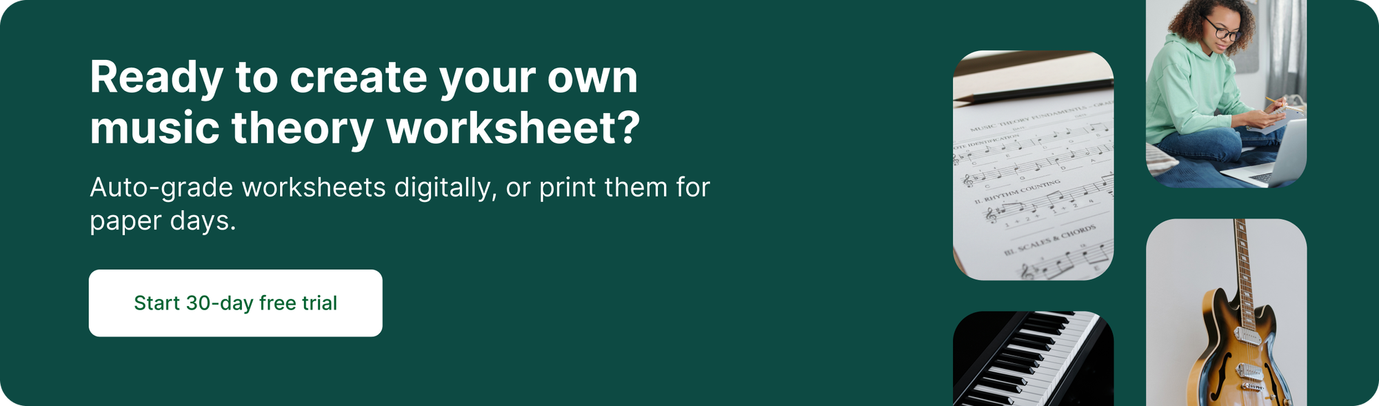Auto-graded worksheets for AP Theory: intervals, key signatures, pitch, rhythm, chord identification. Students complete them digitally and get instant feedback. Grades sync to Google Classroom and the school gradebook automatically.