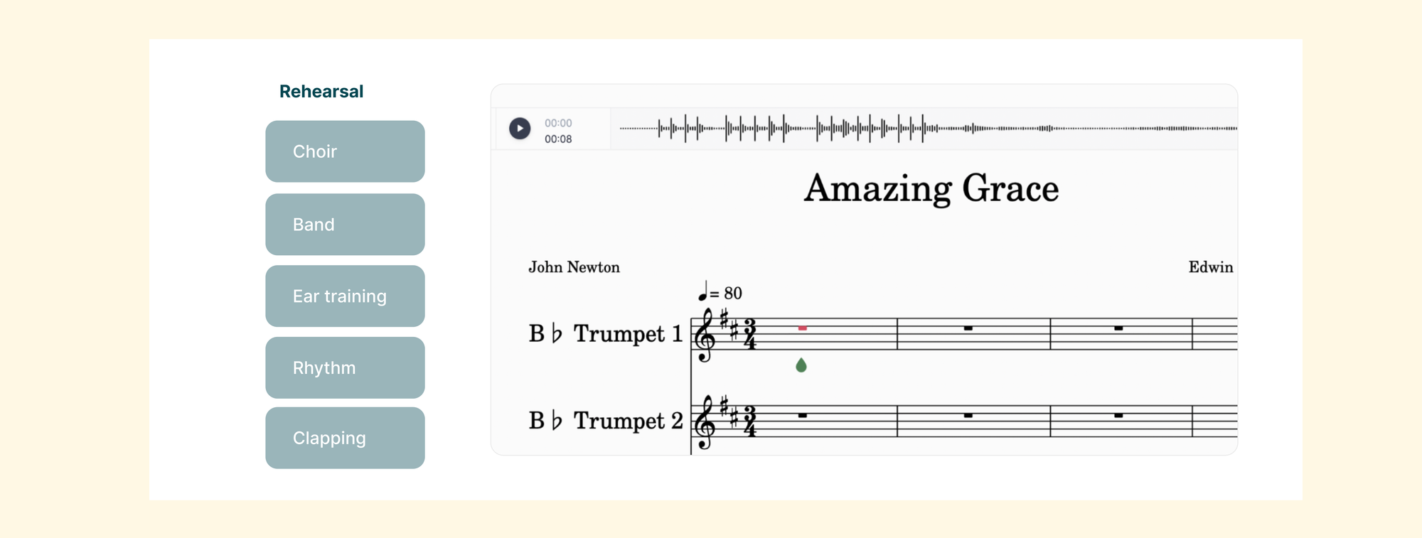Students record performances directly inside the platform using their device microphone. The audio is attached to the score, timestamped, and submitted alongside the notation. Sarah reviews both together.
