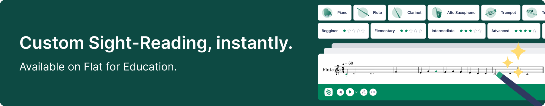 The sight-reading generator is a tool built into Flat for Education that creates unique 8-measure sight-reading exercises on demand. You choose the instrument and the difficulty level. The platform generates a notated exercise instantly. Run the generator again with the same settings and you get a different exercise. Every exercise is unique, which means students cannot share answers or look up the exercise in advance.