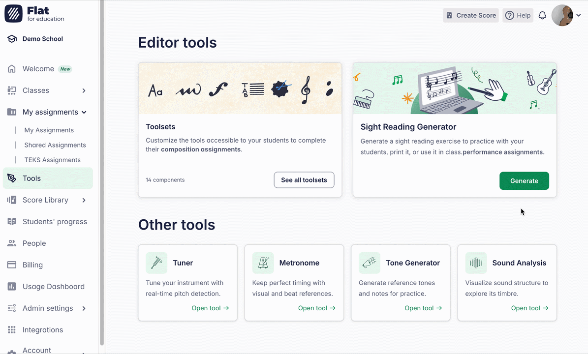 Log into Flat for Education and open the sight-reading generator from your teacher dashboard in the tools section.