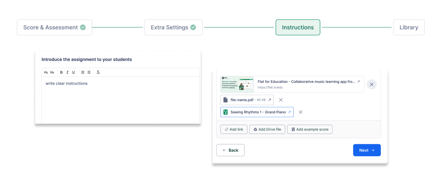 Flat for Education integrates natively with Google Classroom, Microsoft Teams, Canvas, Schoology, and MusicFirst. The assignment appears in students' normal coursework view and grades return automatically to your LMS gradebook when you mark submissions.