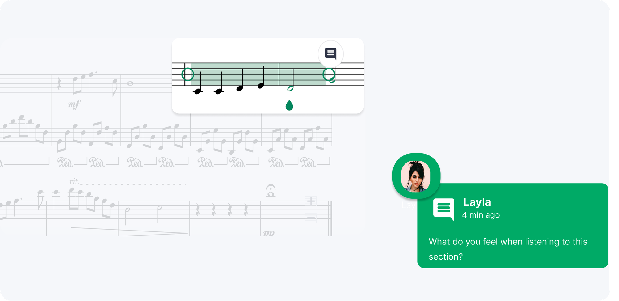 Feedback lived inside the score. Instead of writing comments in a separate document referencing measure numbers, she left timestamped comments directly on the notation – on the specific note, in the specific measure, at the moment of the issue. Students opened their returned submission and saw exactly what she was referring to.