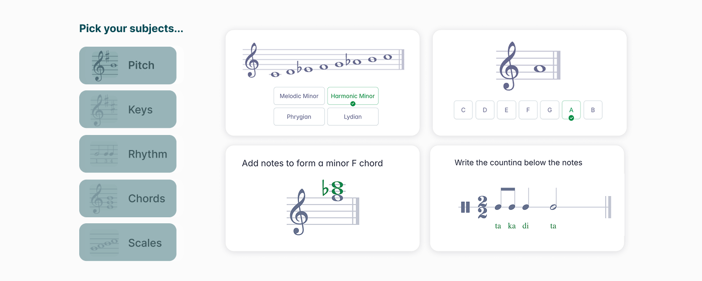 Music theory worksheets. These are auto-graded. You build the worksheet in Flat for Education: interval identification, chord labeling, voice-leading exercises, rhythm completion, and the platform checks student responses against your answer key the moment they submit. The grade goes straight to Canvas. For a theory teacher running three sections, this eliminates a category of grading entirely.