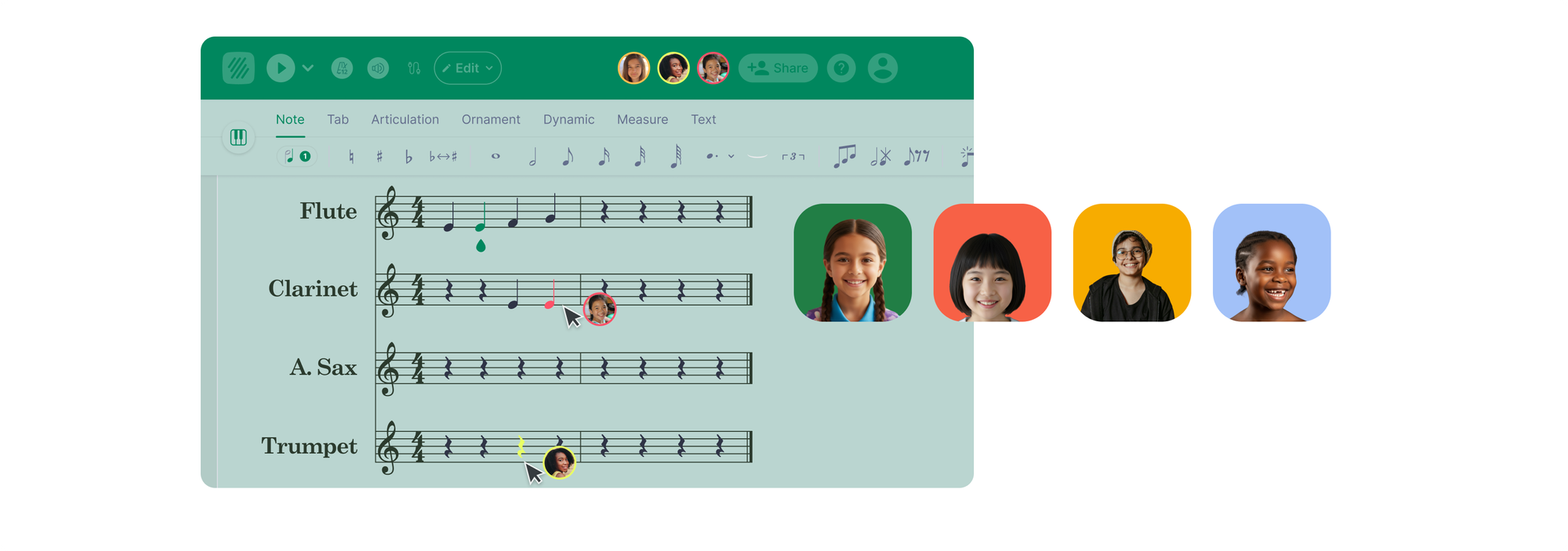 Shared writing. Multiple students work on the same score simultaneously. Useful for group composition projects, arranging assignments, or any task where collaboration is part of the learning. You can watch edits in real time and leave feedback while students are still working.