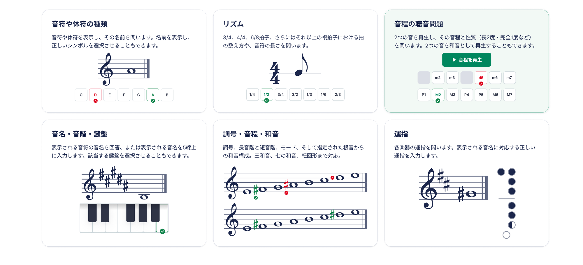 - インターバル(音程)を網羅: 完全一度から八度まで、学習の進捗に合わせて出題範囲をカスタマイズ可能です。