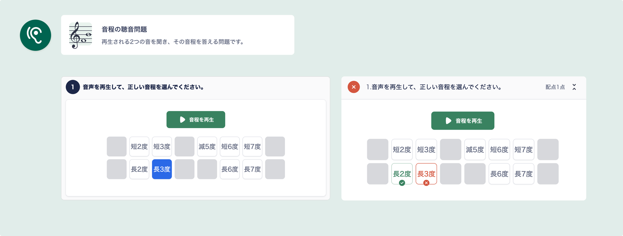 - A: 現在、音程(インターバル)の識別に対応しています。続けて、または和音として再生される音を聴いて回答する形式です。
