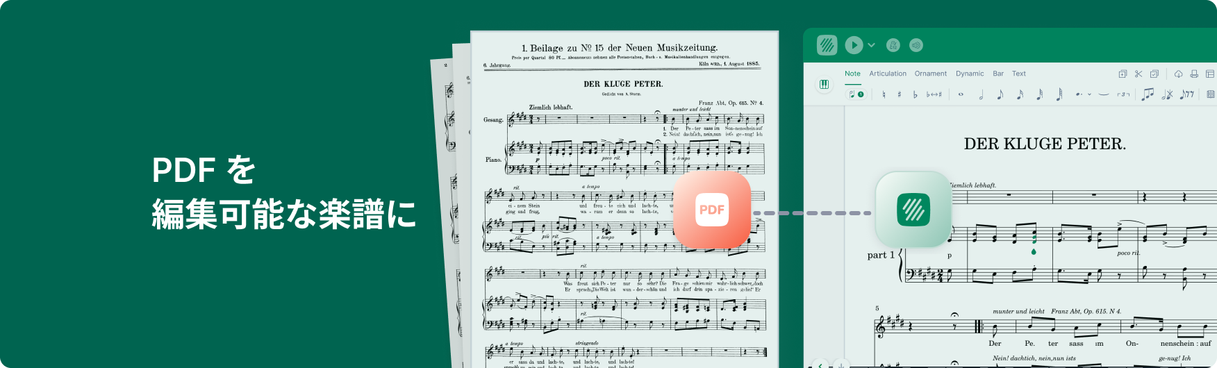 また、PDFの楽譜をFlat for Educationにインポートして、瞬時に編集可能な楽譜データに変換できることをご存知ですか?この機能を使えば、手作業で楽譜を採譜する時間を何時間も節約でき、既存の楽譜をレッスンやリハーサル、課題に合わせて簡単にアレンジできます。