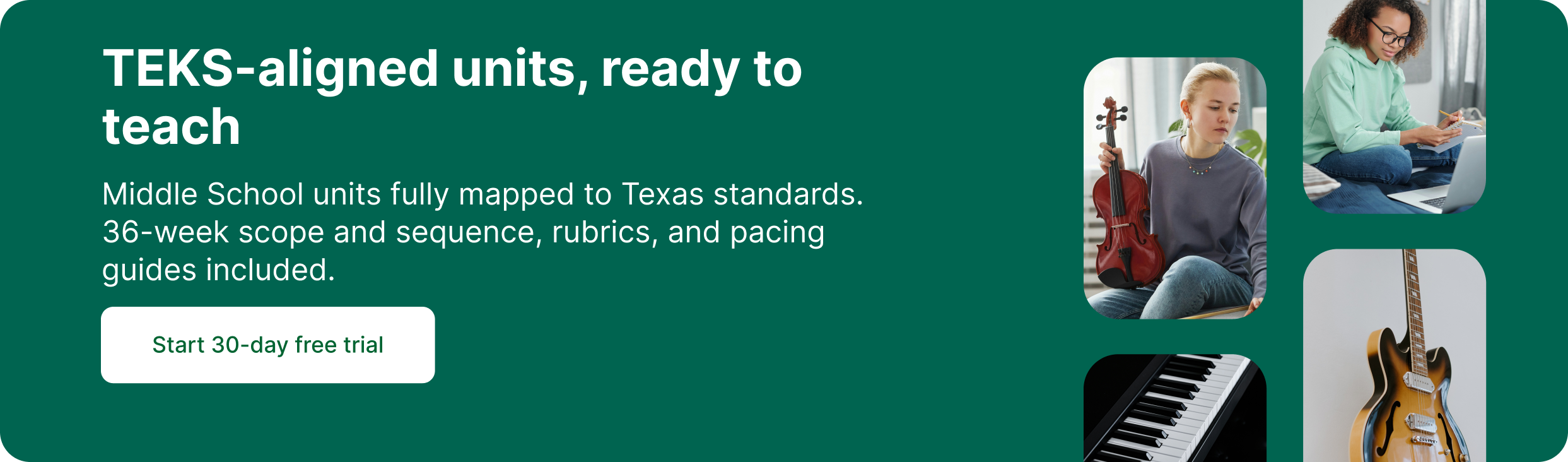 Flat for Education has built TEKS-aligned scope and sequences for Grade 5 and Middle School Music (Grades 6, 7, and 8). Each is fully mapped to Texas standards, with pacing guidance for multiple scheduling models, built-in vocabulary support, student-facing rubrics, and a complete 36-week arc.