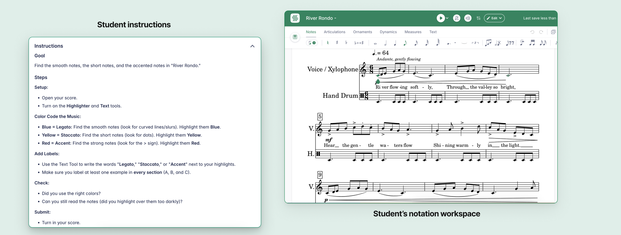 The units are designed to be taught inside Flat for Education's digital platform. Students annotate scores, compose within structured parameters, record performances, and submit work – all in one place. Teachers can track progress by student, by standard, and by strand. Instructional leaders can see program-wide data.